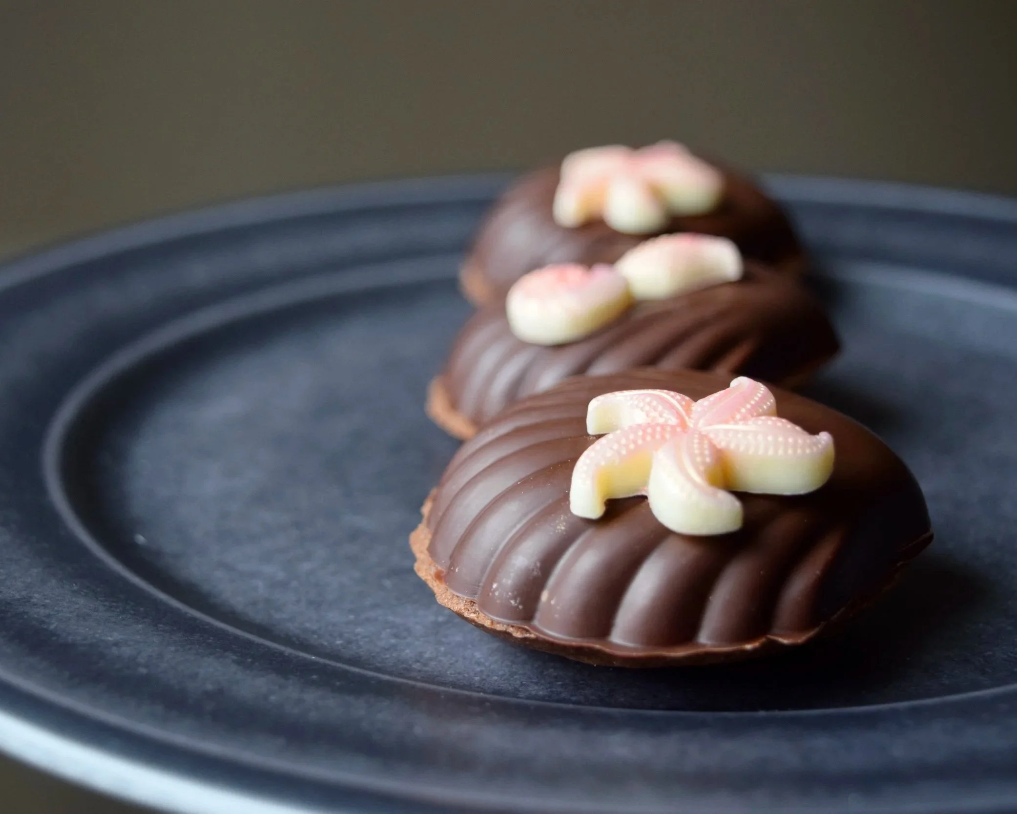 We use only high quality Belgian chocolate to glaze our madeleines.